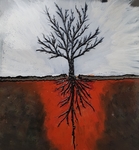 2018Boom boven en onder de grond. Boom ligt in reliëf gespoten olieverf op schilderij. Het naakte staal is zichtbaar gemaakt als bodem. 40x40cm.