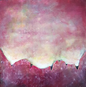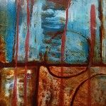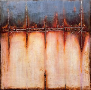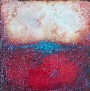 2020Olieverf op stalen plaat met roest in wit, blauwgrijs en rood 60x60cm.