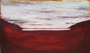 2020Geabstraheerd en expressief landschap. Compositie in rood, wit en roest. Olieverf op staal. 60x90cm.