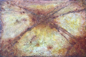 2022Olieverf op staal, met roest. Het werk verbeeldt de ontmoetingen, de misverstanden, de chaos, maar ook de hoop, het licht. 60x90cm.