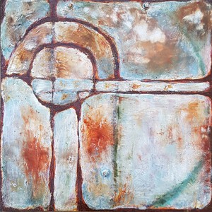 2019Abtsract beeld. Door de toepassing van roest op sommige plekken zal het kunstwerk zich blijven ontwikkelen. Olieverf op stalen paneel. 40x40cm.