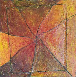 2021Een driedimensionaal kunstwerk, Blik op staal. Een strak patroon in roest, roestkleuren en oker. Het werk is nu drie jaar oud en ik kan daardoor zien dat het roesten heel, heel langzaam verder gaat. 60x60x5cm.