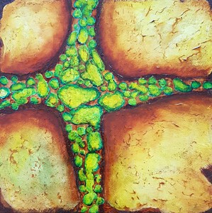 2018Bodemlagen, stenen, dood materiaal, maar toch warm en schijnbaar levend. Op staal 40x40cm.