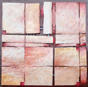 2019Stenen en bodemlagen. Dood materiaal, maar door kleuren en op sommige stukken roestend staal toch levend. Olieverf op stalen paneel. 40x40cm